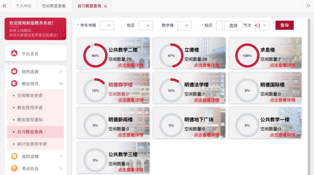 选择一:微人大-个人中心-教室借用-自习教室查询